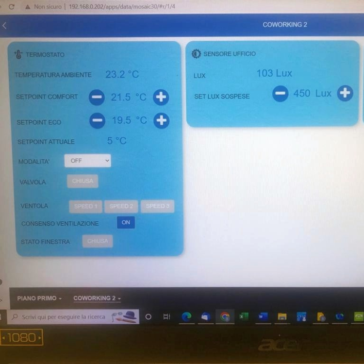 Abbiamo un controllo centralizzato dei set point per i termostati, in modo da rispettare le normative nazionali sulla temperatura. Inoltre abbiamo installato dei sensori di presenza per portare in modalità ECO il riscaldamento quando uno spazio rimane vuoto per più di 10 minuti, per mantenere la temperatura, abbattendo i consumi.